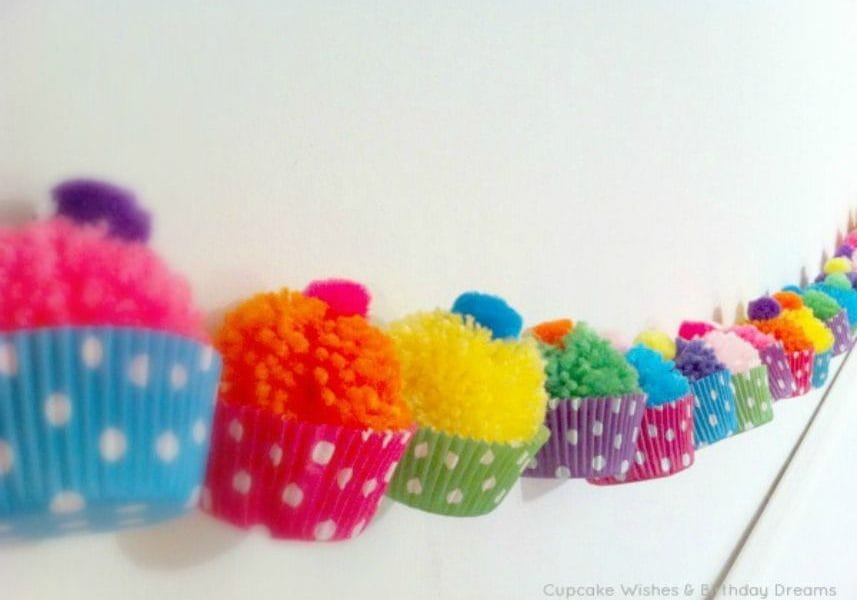 Make craft cupcakes with your favorite color of yarn. Then add a pom pom on top to make it even cuter. String them all together for an adorable garland that is perfect for a birthday party!